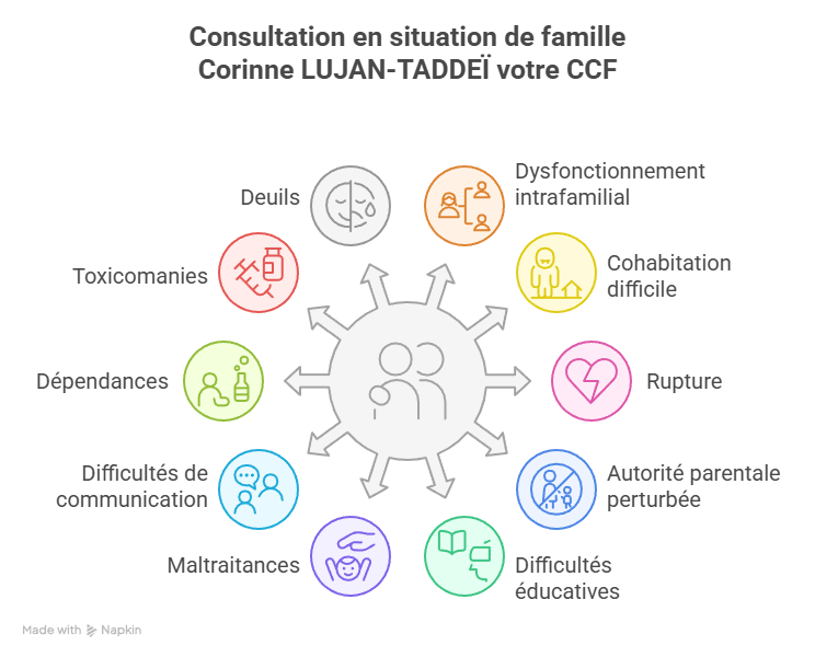 - Des situations de rupture, de deuil, ou des conflits liés aux familles séparées et recomposées.